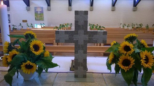 Skulpturer i sten og korset på gavlen